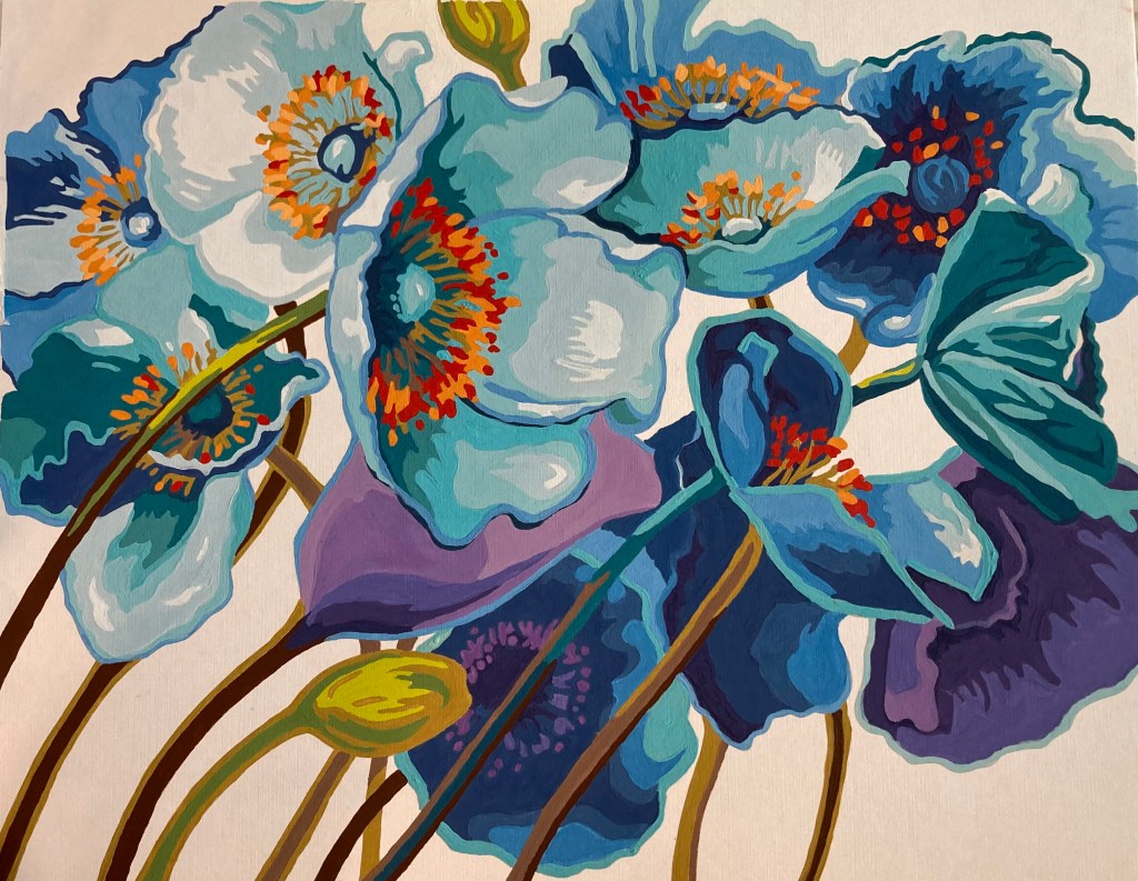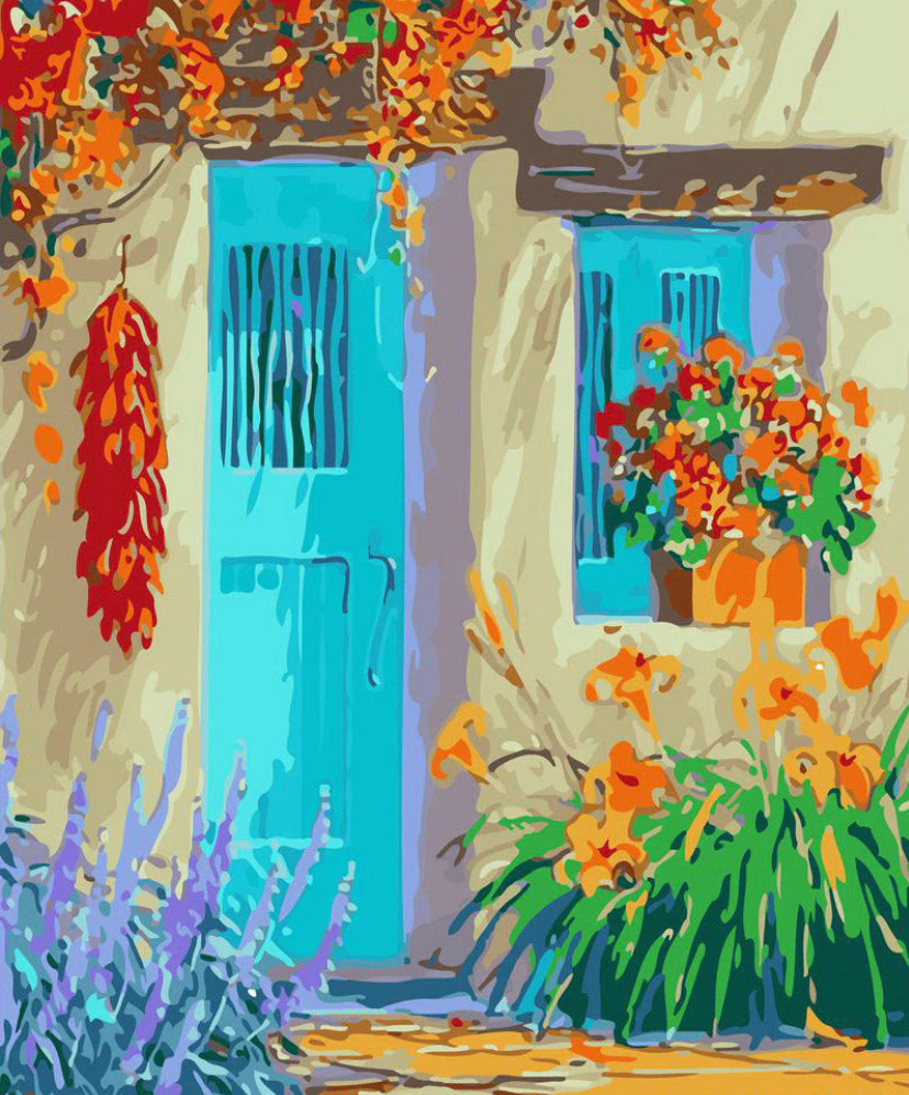 BTW—The following blue flower painting is the one I worked on after Steve was settled for the night when he was in home Hospice, and then I finished in the weeks after he died. The turquoise door painting is the kit I’m thinking of starting. These painting kits are a relatively mindless creative activity that still requires a lot of concentration (a great distraction), and I love working with colors. This new one reminds me of summer in the AZ desert. Gee, I guess I do love working with colors!